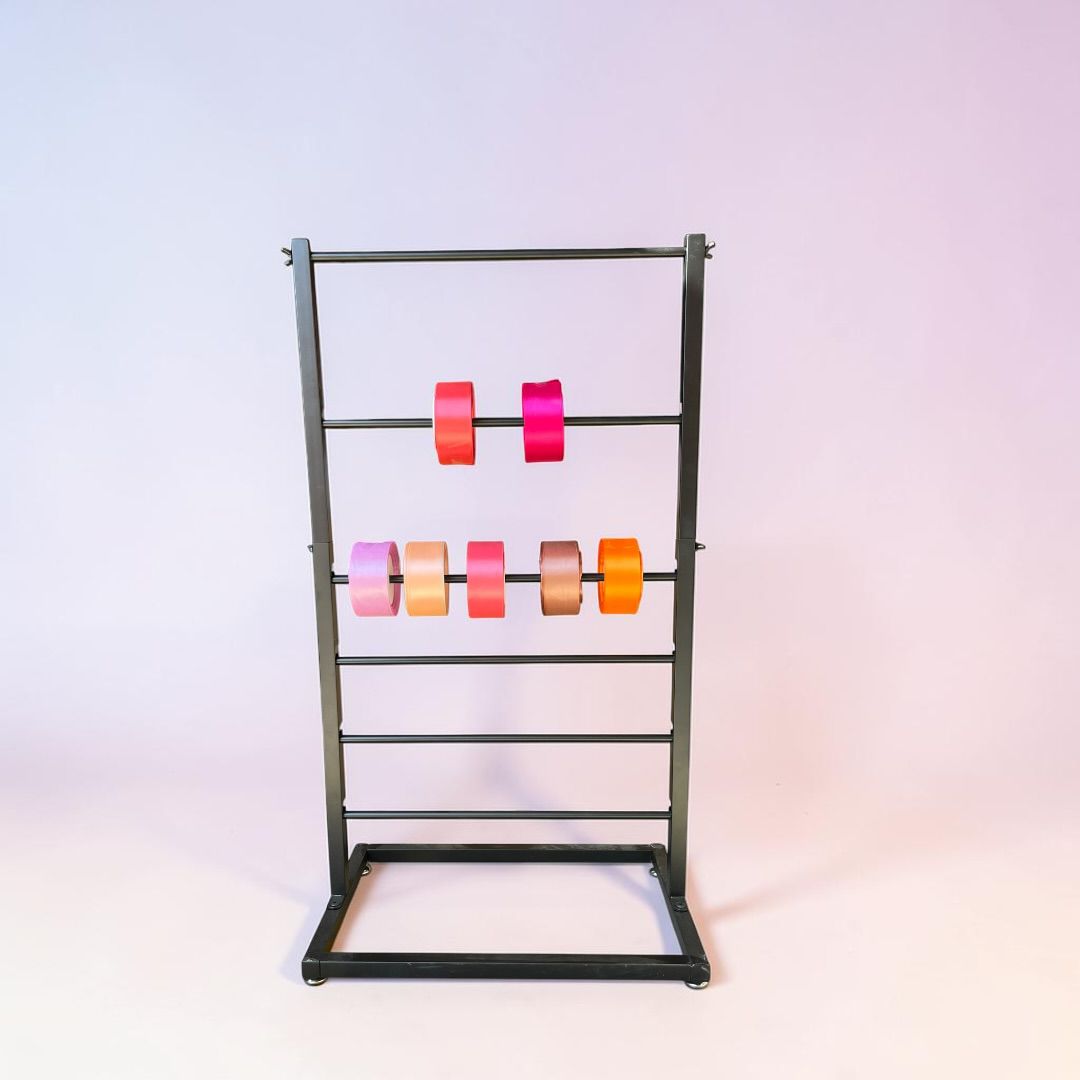 Organiza y exhibe tus cintas de forma práctica, ordenada y profesional con este exhibidor metálico de 6 barras, ideal para florerías y espacios de trabajo 💐