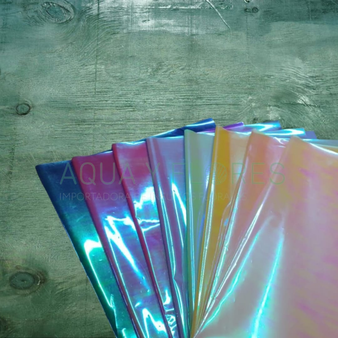 ¡Haz brillar tus arreglos con nuestro papel coreano tornasol! 💫 Este papel tiene un acabado brillante y tornasolado que refleja distintos colores según la luz, creando un efecto visual único y llamativo.