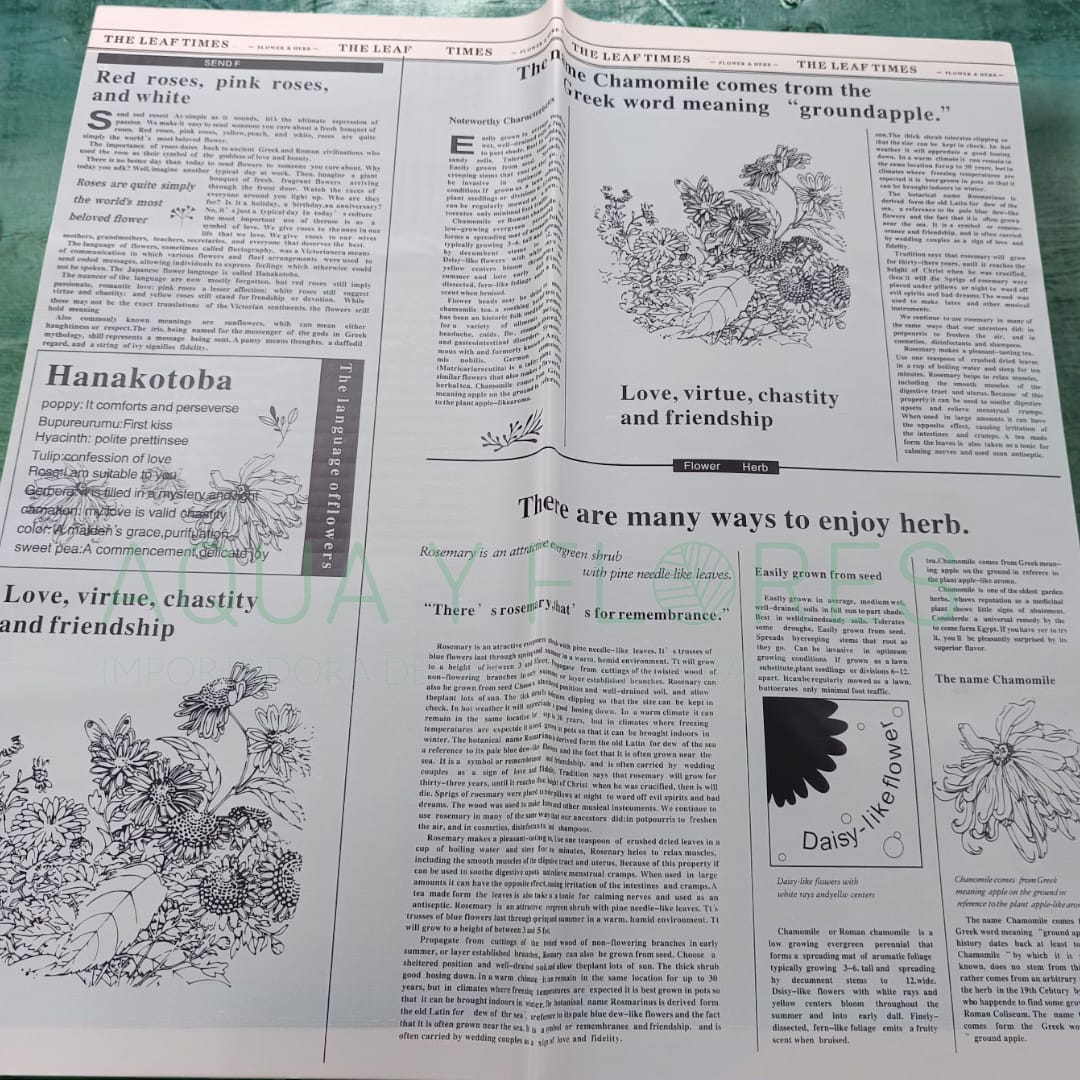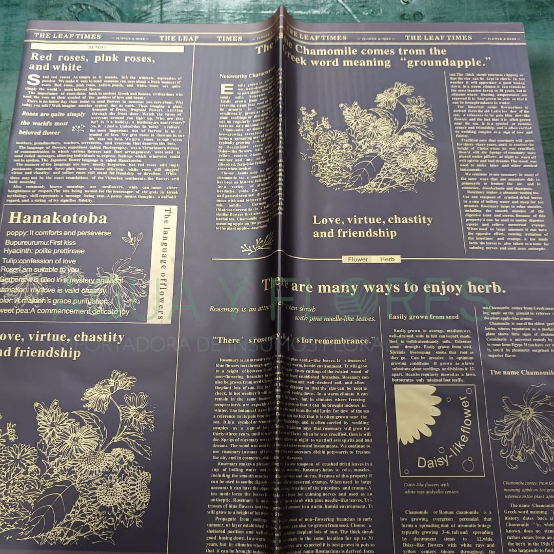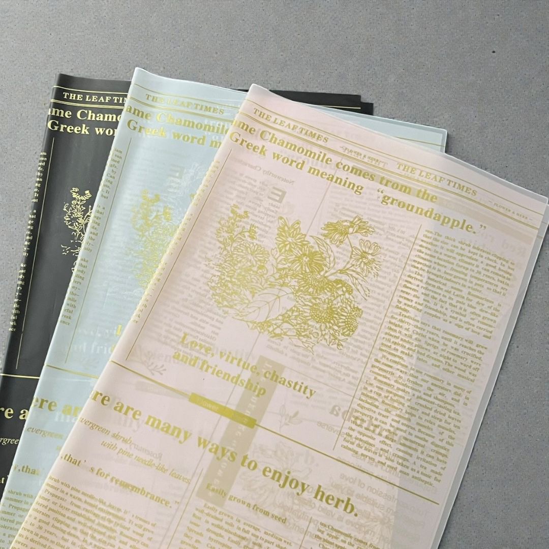 Agrega delicadeza y un aire vintage a tus arreglos florales con el Papel Coreano Semi-Translúcido «Chamomile». Su diseño tipo periódico con tipografía clásica y acabado semi-transparente crea un efecto elegante y sutil, ideal para envolver flores sin opacar su belleza natural.